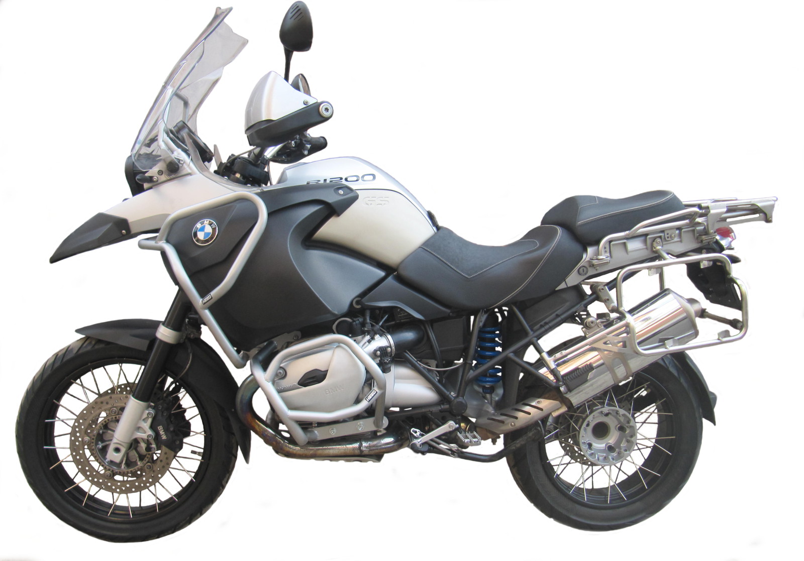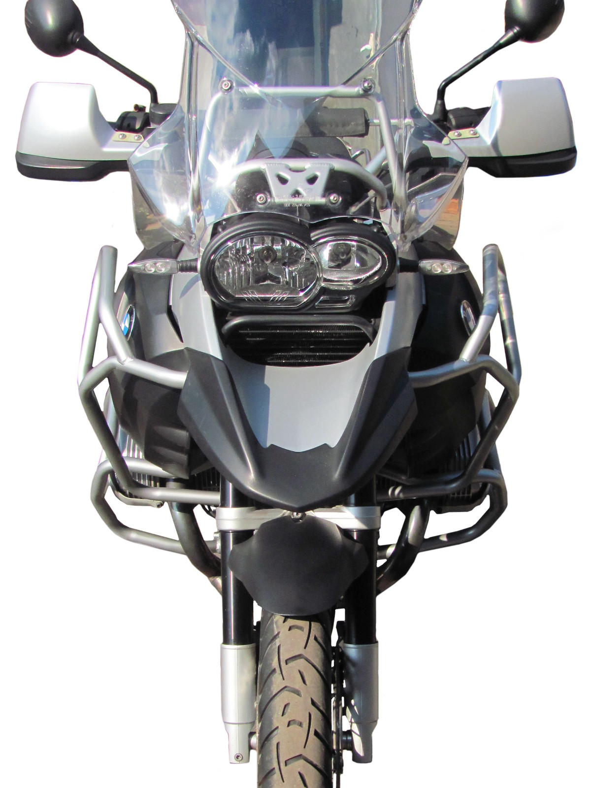 Zestaw górnych i dolnych gmoli przeznaczony dla motocykli BMW R 1200 GS Adventure produkowanych od 2009 do 2012 roku wraz z ochronnymi nakładkami na gmole.