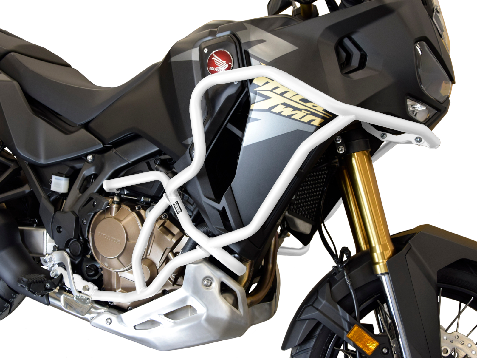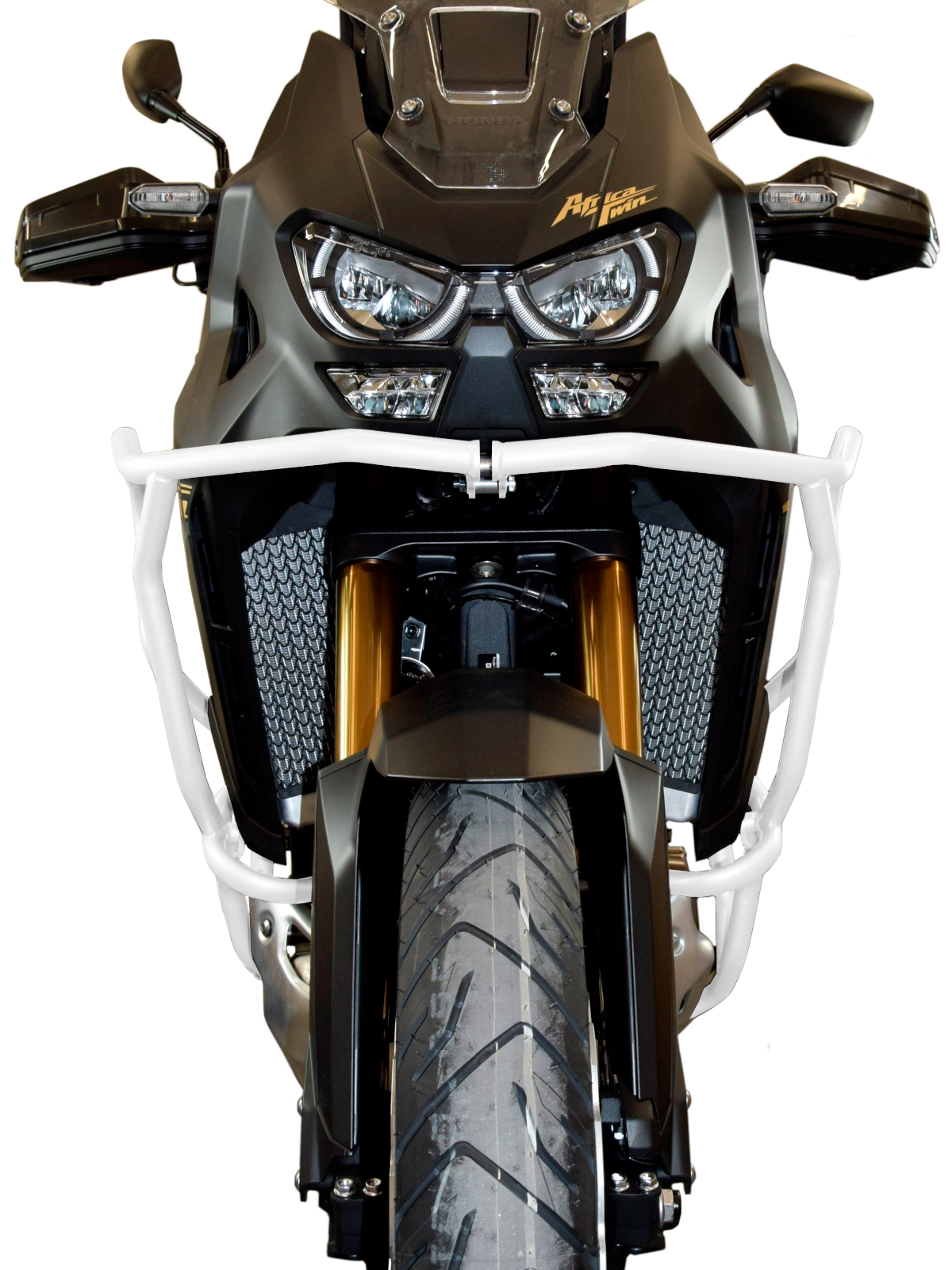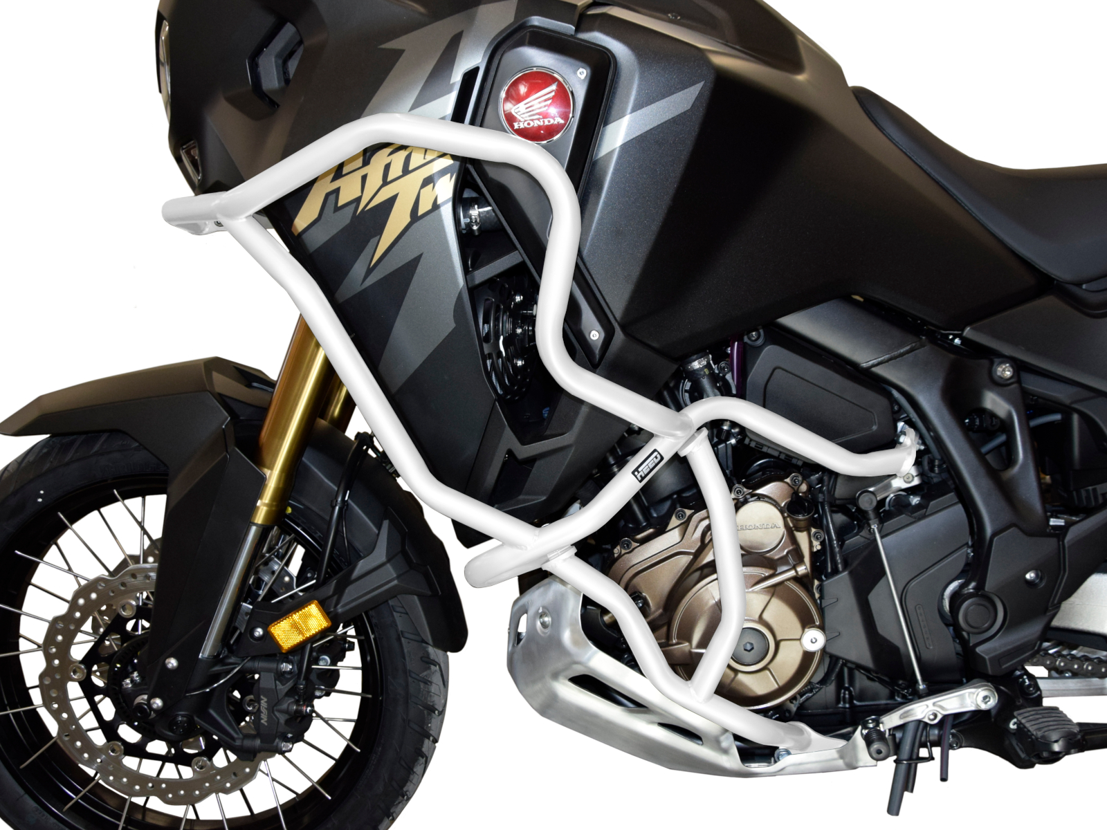 Zestaw górnych i dolnych gmoli w kolorze białym dedykowany dla motocykli Honda CRF 1100 Africa Twin Adventure Sports z manualną skrzynią biegów, produkowanych od 2024 roku wraz z ochronnymi nakładkami na gmole.